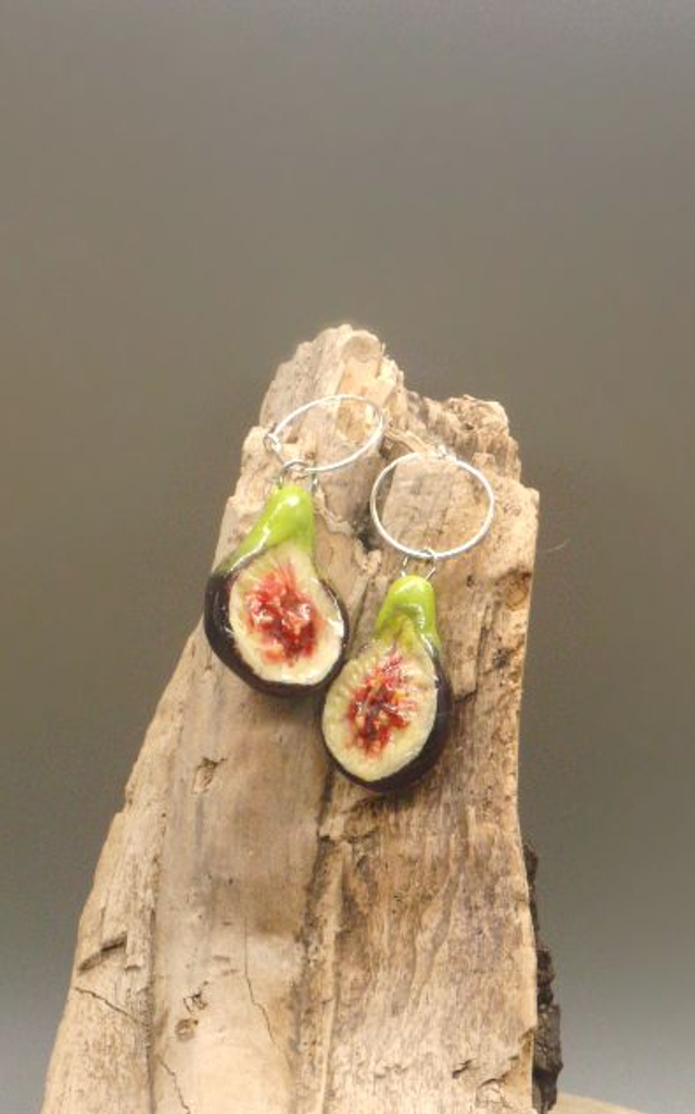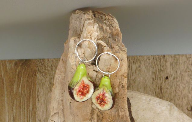 These earrings have been made with polymer clay, resin and Sterling silver earring hoops.